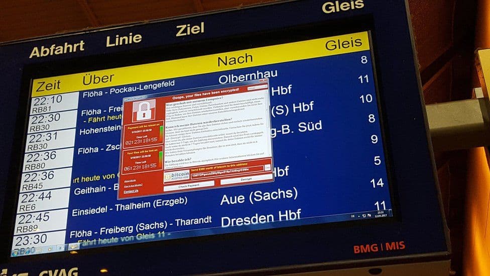 German Railways saw themselves hit with it. So not only were we looking at a potential healthcare disaster here, we were looking at infrastructure problems. I've put a screenshot of one situation where the schedule for the German rail system is cutoff by the wannacry ransom note.