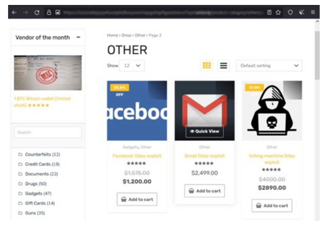 When you look closer you start to see the filters though that say "Counterfeits", "Drugs", "Gadgets", and Other. And earlier in 2022, if you looked in other you'd see three different zero day exploits for sale. Remember, zero day exploits aren't known to the vendor until they're reported so these are big.