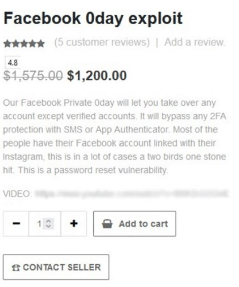 For $1,200 dollars you can get a Facebook zero day that claims to "let you take over any account except verified ones, and that it will bypass 2fa"