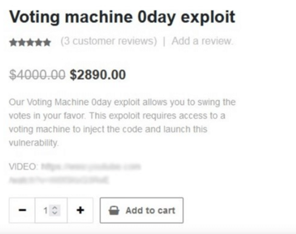 For almost 3k you can get a voting machine exploit that lets you swing votes in your favor if you have access to the machine. A little harder because of how it needs to be delivered but still a major impact.